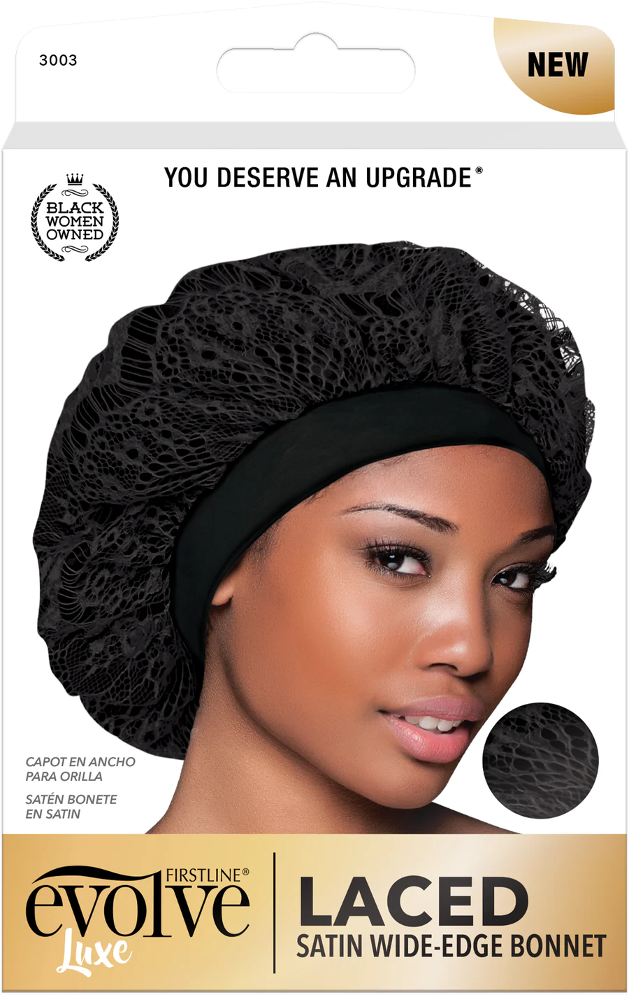 #3003 Evolve Laced Satin Wide-Edge Bonnet / Black (6PC) is backordered and will ship as soon as it is back in stock.