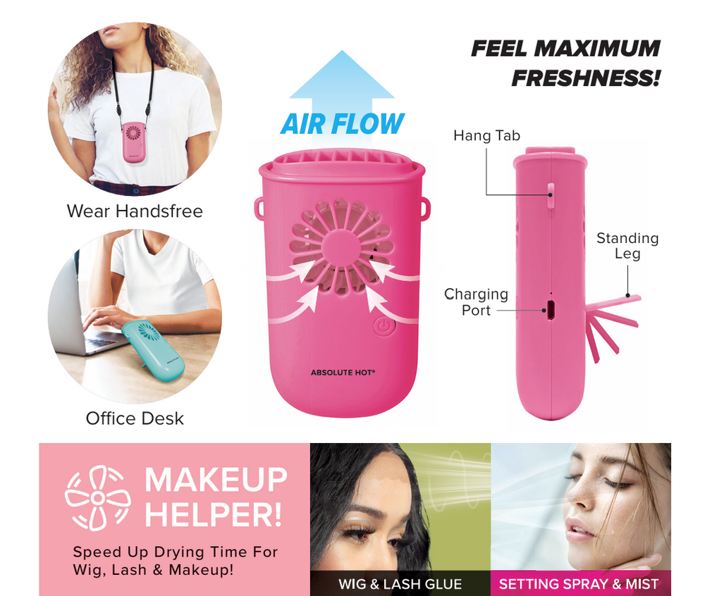 A handsfree, essential tool to keep you cool wherever you go & speed up the drying time of your skincare, makeup & more !