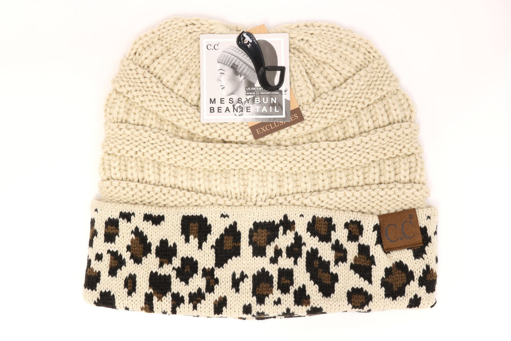 C.C. Matching Cuff Leopard Print Messy Buns Beanie #MB80 (PC) - BEIGE is backordered and will ship as soon as it is back in stock.