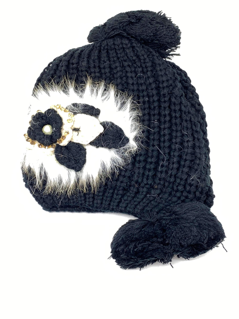 #MHA2549BK Double Dangle Flower Pom Black Beanie