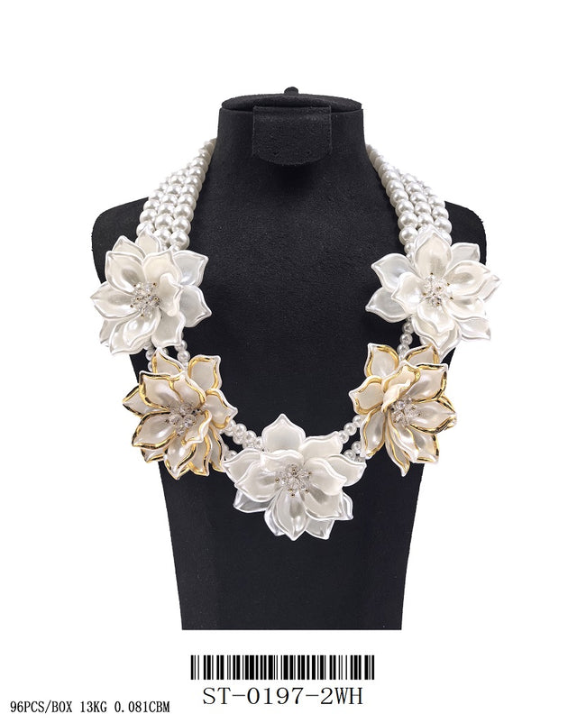 Fashion White Pearl Floral W/Gold Trim Statement Necklace #ST-0197-...