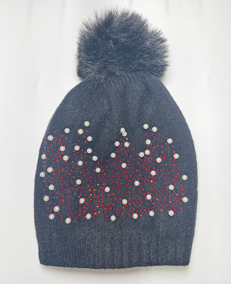 Fashion Pearl & Rhinestone Pom Pom Beanie #WH169 Black (PC)